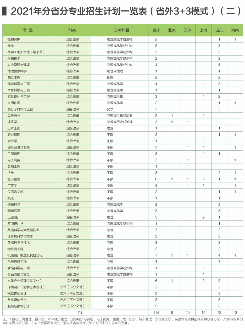 浙江农林大学2021年(省外)分省分专业招生计划一览表