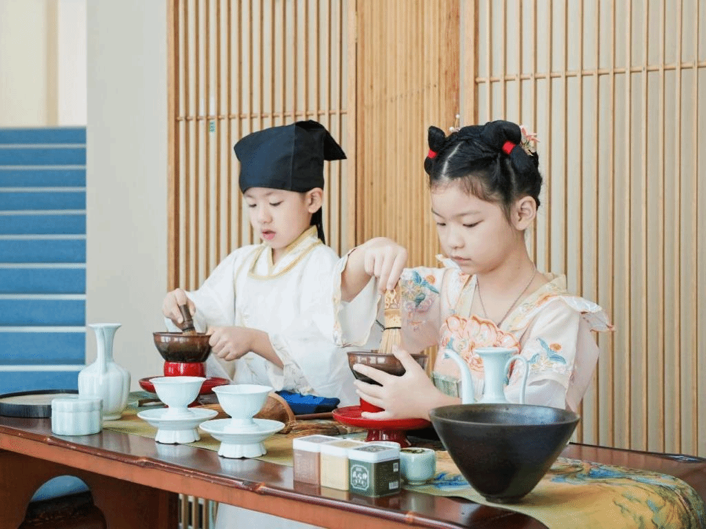 图:学院师生及小茶人展示茶艺、演奏古琴