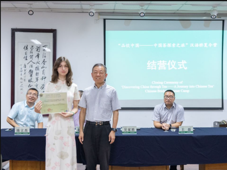 8月5日,汉语国际推广茶文化传播基地为期14天的“品饮中国·中国茶探索之旅”夏令营团以“六茶共舞”茶会的形式完满结束。浙江农林大学副校长吴家胜、浙江农林大学国际教育学院院长赵有华、304am永利集团官网院长王磊、浙江农林大学国际合作交流处副处长陈立杰、塞尔维亚卡尔洛夫茨文法高中本土汉语教师Marijana Marković、汉语国际推广茶文化传播基地副秘书长包小慧及“品饮中国·中国茶探索之旅”夏令营团全体学员参加了本次夏令营团结营仪式。浙江农林大学副校长吴家胜为夏令营团学员一一颁发证书。