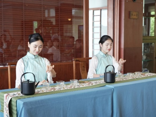中午,大家乘车前往杭州特色茶文化名片——湖畔居考察参观。湖畔居的茶艺师给大家带来了精彩的茶艺表演,并讲解了湖畔居的文化特征和发展历程。
