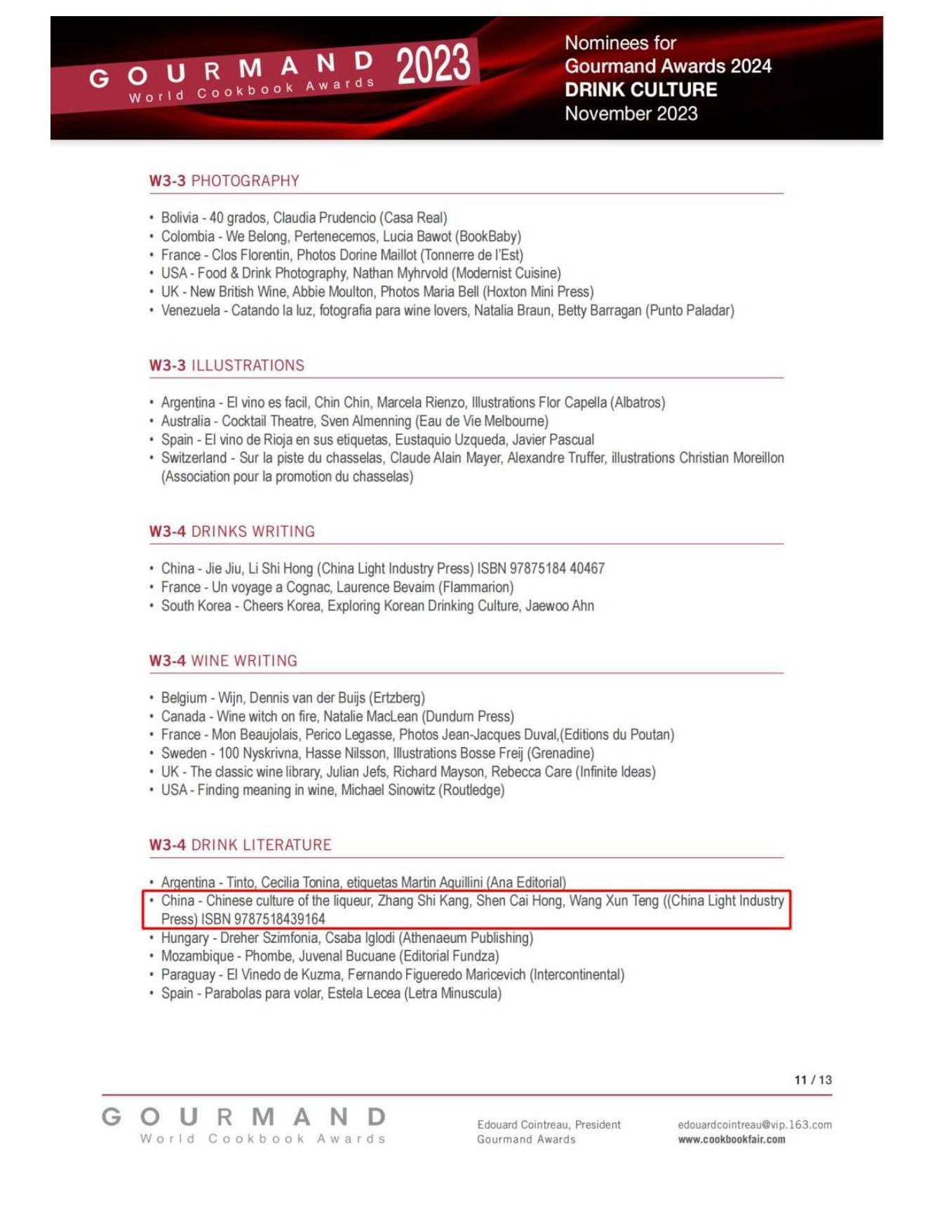 据了解,世界美食美酒图书大奖由法国君度世家继承人爱德华·君度(Edouard Cointreau)于1995年创立,是全球最权威的美食美酒图书奖项,被誉为国际美食美酒“奥斯卡奖”。每年,该奖项会对全球205个国家出版的十几万种饮食类图书进行市场采集、整理和比较,评选出最佳美食和美酒图书奖项。