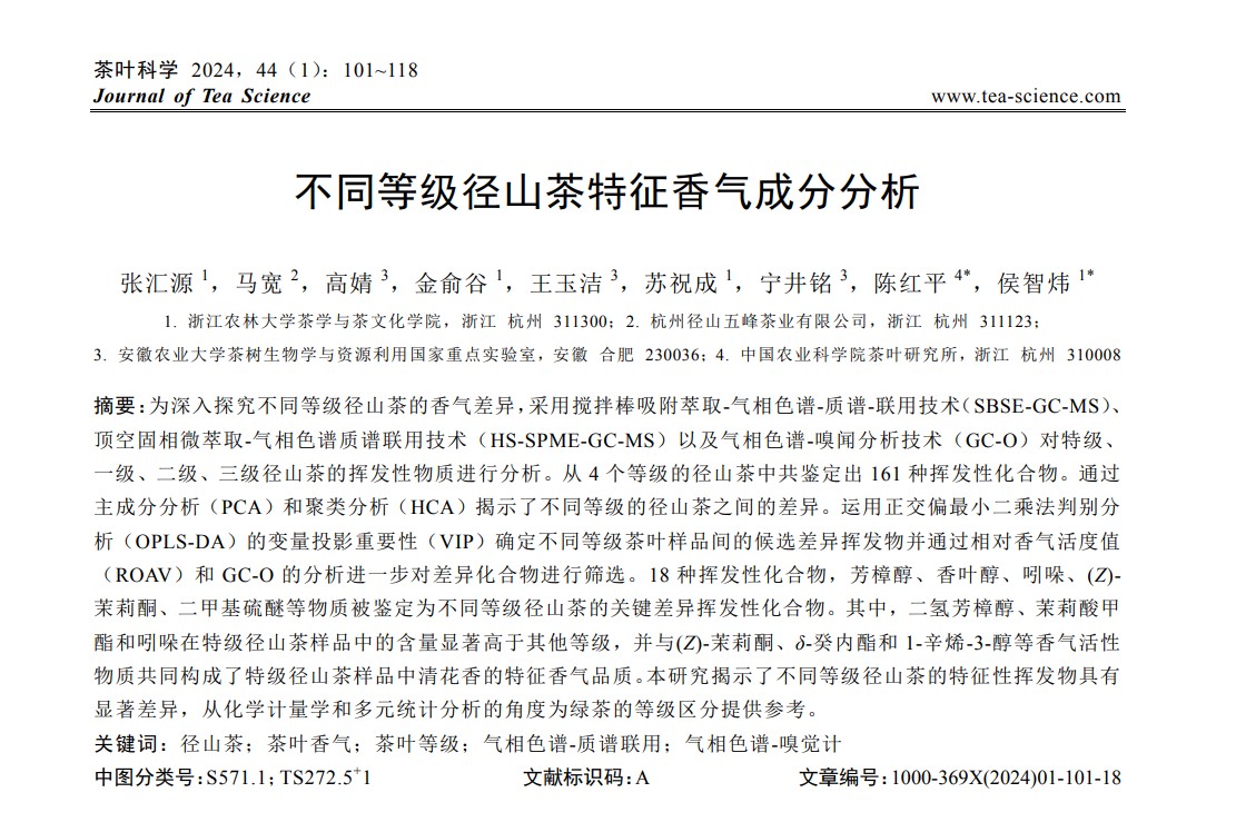 2024年3月13日,侯智炜老师指导2021级本科生张汇源在《茶叶科学》(A类中文核心期刊)发表了题为《不同等级径山茶特征香气成分分析》的研究论文。该研究揭示了不同等级径山茶的特征性挥发物具有显著差异,研究结果有助于进一步丰富径山茶风味化学物质理论,为加工生产中提高径山茶香气品质提供科学依据。
