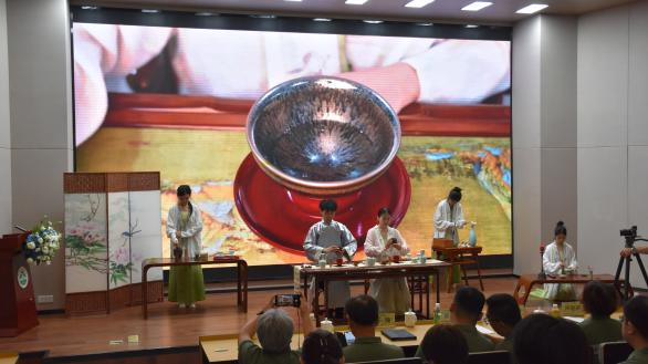 暖场环节由新生辅导员何秀锋主持,“一起摇摆”茶固体饮料冲泡环节,现场气氛在摇摆中变得更加热烈。之后由茶礼队带来茶艺表演《宋韵点茶》,带领大家穿越千年,感受宋代茶文化的魅力。