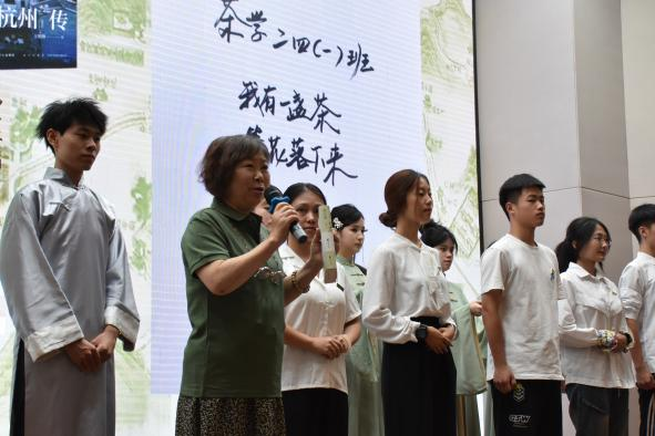 接着,名誉院长王旭烽讲话,深入阐述了茶文化的内涵和价值。她指出:茶不仅是一种饮品,更是一种文化、一种生活方式,茶文化蕴含着深厚的哲学思想、审美观念和人文精神,是中华民族传统文化的重要组成部分,作为304am永利集团官网的学生,肩负着传承和弘扬茶文化的重任。并为新生班级赠送了《望江南》《杭州传》《吴越王》《王旭烽散文》《等花落下来》书籍,留下寄语。