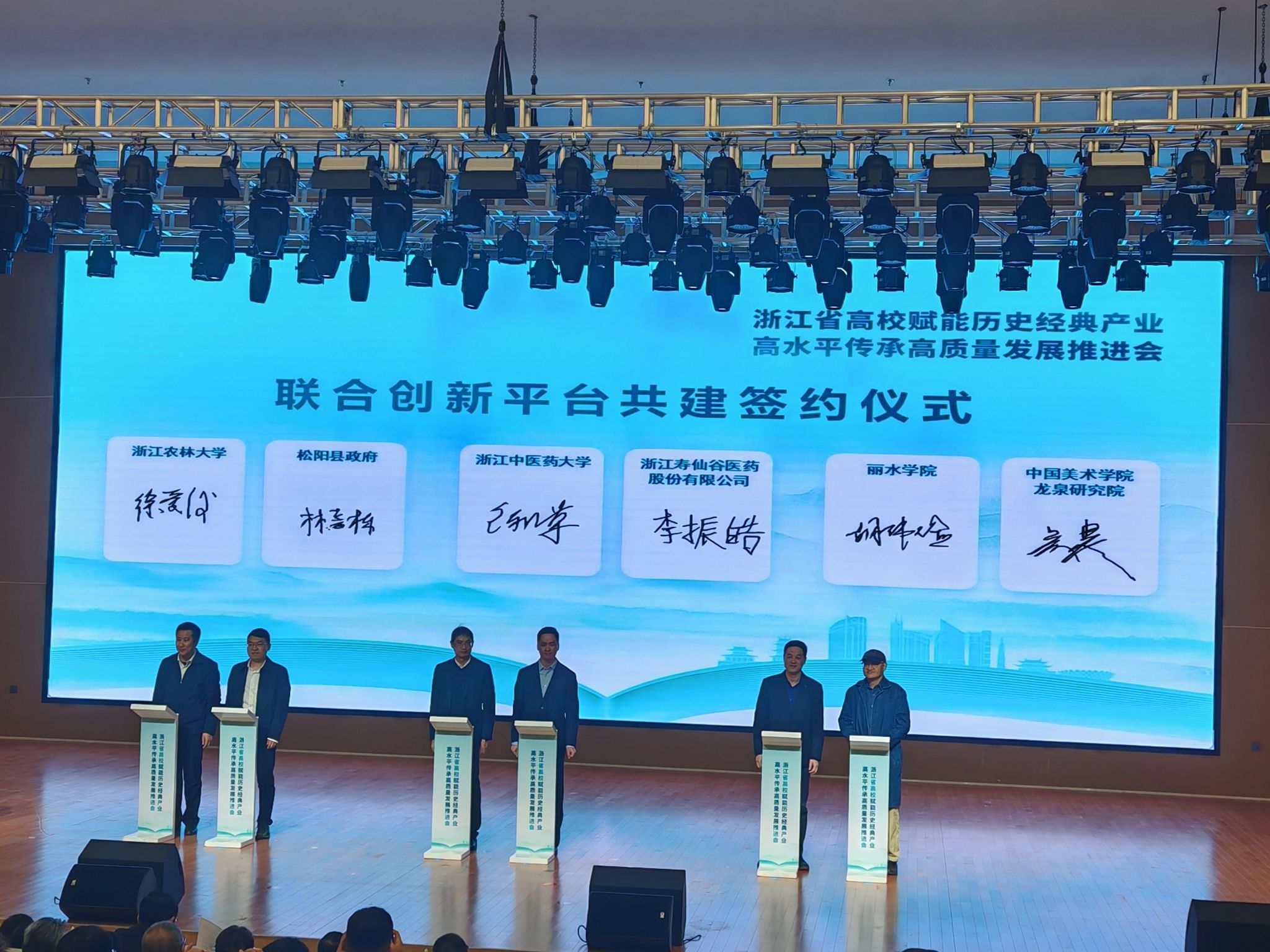 活动现场,我校分别与松阳县政府、浙茶集团、九曲红梅楼龙肖大师工作室、浙茶集团陈星董事长就联合创新平台、联合创新团队、大师工匠工作室、产业导师进行了签约,共同见证科教联盟成立。