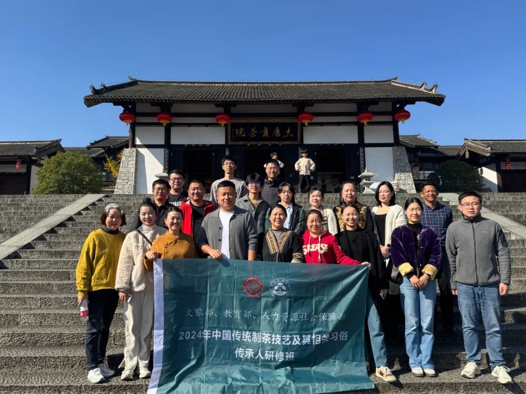 研修班学员们来到大唐贡茶院进行参观。大唐贡茶院始建于唐大历五年,即公元770年,是专为朝廷加工茶叶的“皇家茶厂”。它以制作唐代著名的贡茶——顾渚紫笋茶而闻名。大唐贡茶院不仅是中国茶文化的重要遗迹,还被评为浙江文化标识培育项目,进一步彰显了其在茶文化领域中的显著地位和深远影响。