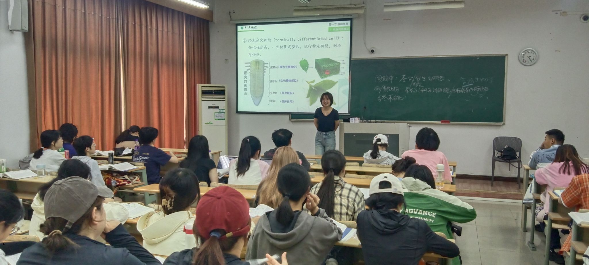本次示范课内容是《茶树分子与细胞生物学》课程第十二章。主要内容是多细胞生物的细胞群体分类、植物细胞周期的三个特点、茶树芽休眠的定义与类型,重点是茶树芽休眠的定义与类型、影响茶树芽休眠的影响因素(如温度、光照、营养等),讲到重点知识时,吕务云老师拓展延伸到芽休眠的研究成果,扩展到芽休眠基因等学科前沿知识。