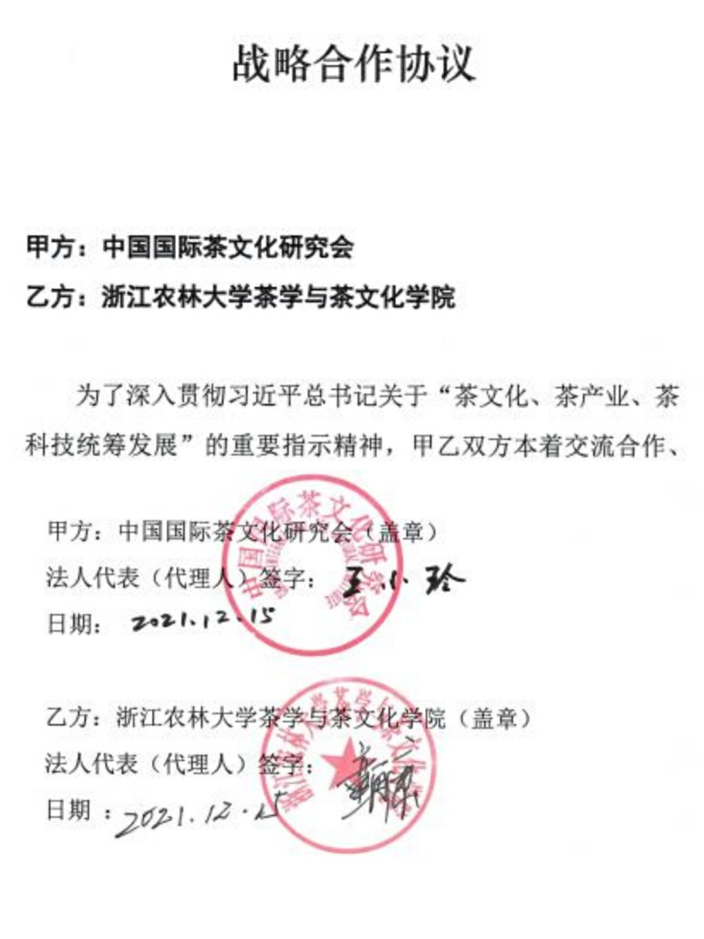 此前,中国国际茶文化研究会一直对学校茶文化专业建设、相关领域人才培养、国际茶文化交流与合作给予多方面指导和帮助,此次成功签订战略合作协议是在之前双方多年深入的富有成效的合作基础上的进一步深化,双方将在此基础上更加紧密深入合作,共同推动国家茶文化领域人才培养、社会服务和产业发展,并全力推动中国茶文化走出国门,走向世界。